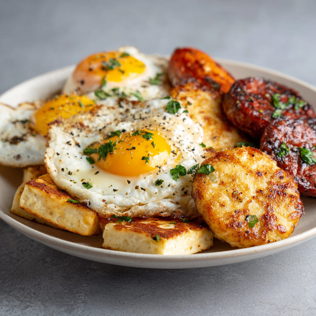 An assortment of Fried Eggs, Halloumi, Anari and Loukaniko.
