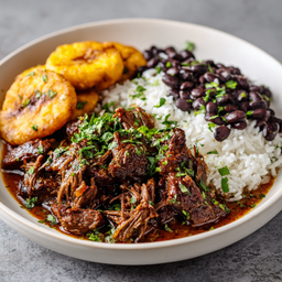Slow Cooked Pulled Beef Stew served with Black Beans, Fried Plantains, and White Rice.
