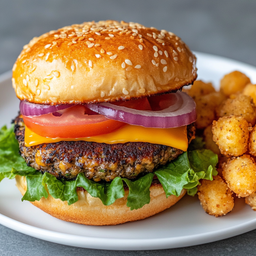 Seasoned Grilled Plant Based Burger Patty on Soft Sesame Bun topped with American Cheese, Lettuce, Tomato, and Red Onion served with Tater Tots and Secret Sauce .